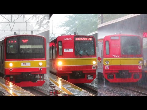 Kereta Rel Listrik datang dan berangkat dari Stasiun Univ. Indonesia disaat hujan deras, ada JR 205, TM 6000, dan TM7000 dengan tujuan Jakarta Kota, Bogor ...